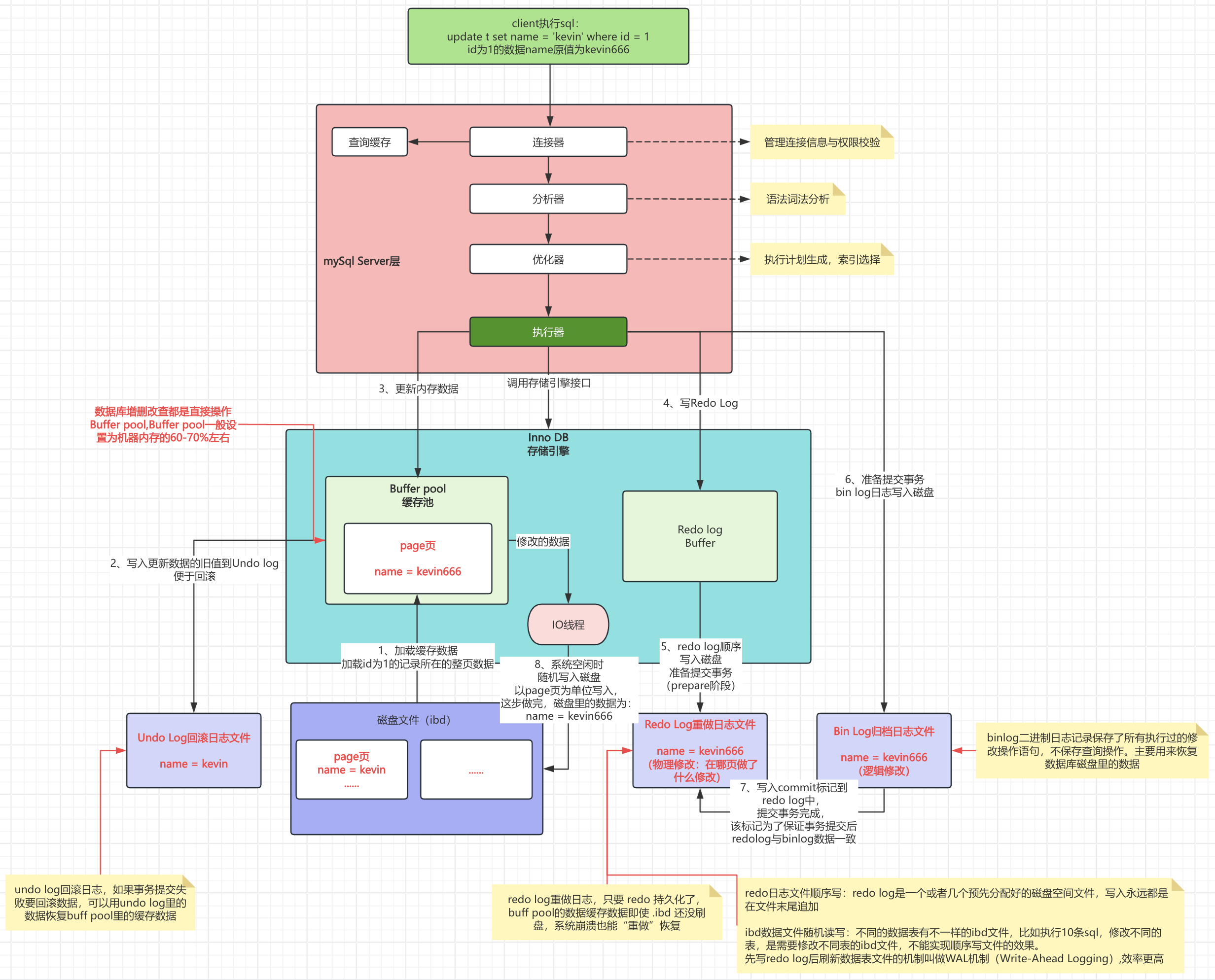 因为来一个请求就直接对磁盘文件进行随机读写,然后更新磁盘文件里的数据性能可能相当差。 磁盘随机读写的性能是非常差的,所以直接更新磁盘文件是不能让数据库抗住很高并发的。 Mysql这套机制看起来复杂,但它可以保证每个更新请求都是更新内存BufferPool,然后顺序写日志文件,同时还能保证各种异常情况下的数据一致性。 更新内存的性能是极高的,然后顺序写磁盘上的日志文件的性能也是非常高的,要远高于随机读写磁盘文件。 正是通过这套机制,才能让我们的MySQL数据库在较高配置的机器上每秒可以抗下几千的读写请求。