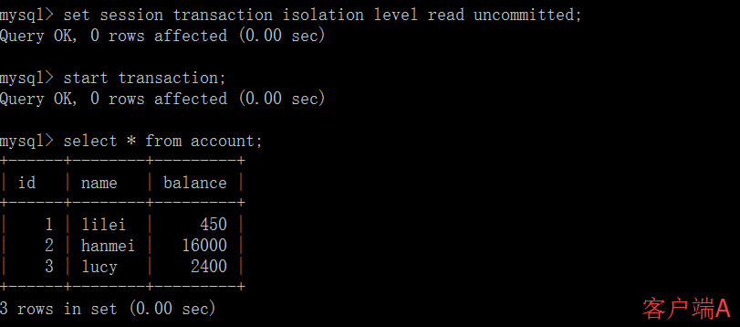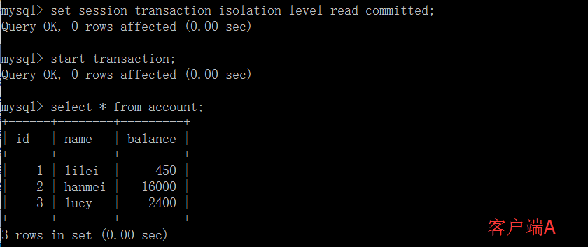 (3)在客户端A查询表account的所有记录,与步骤(1)查询结果一致,没有出现不可重复读的问题