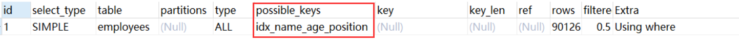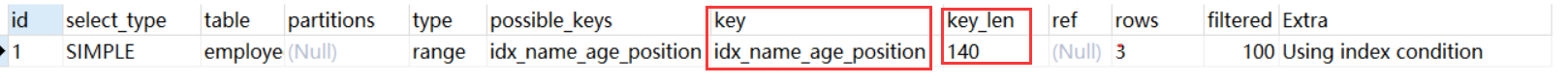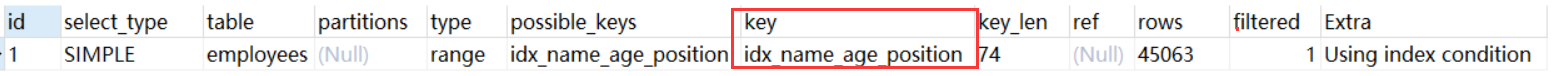 分析:从explain的执行结果来看:key_len=74,查询使用了name索引,由于用了position进行排序,跳过了age,出现了Using filesort。